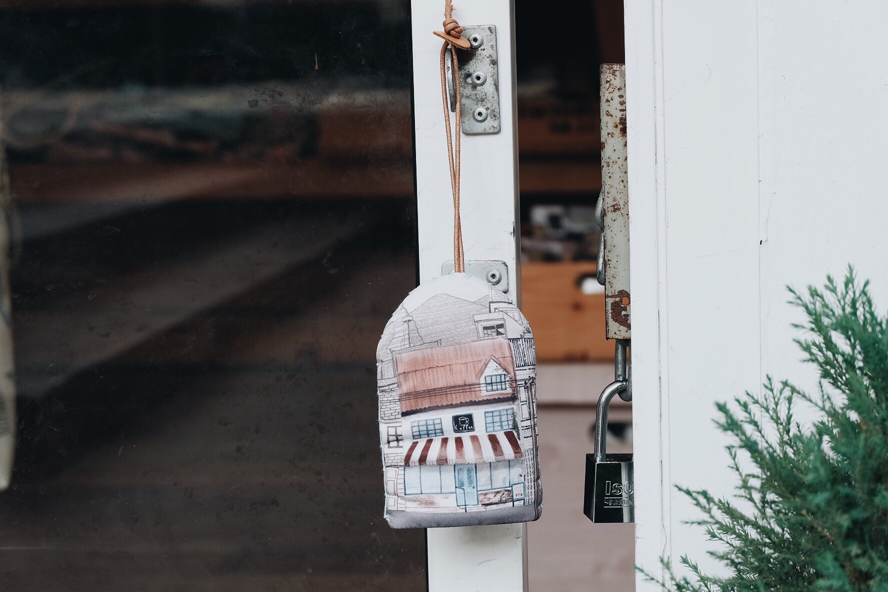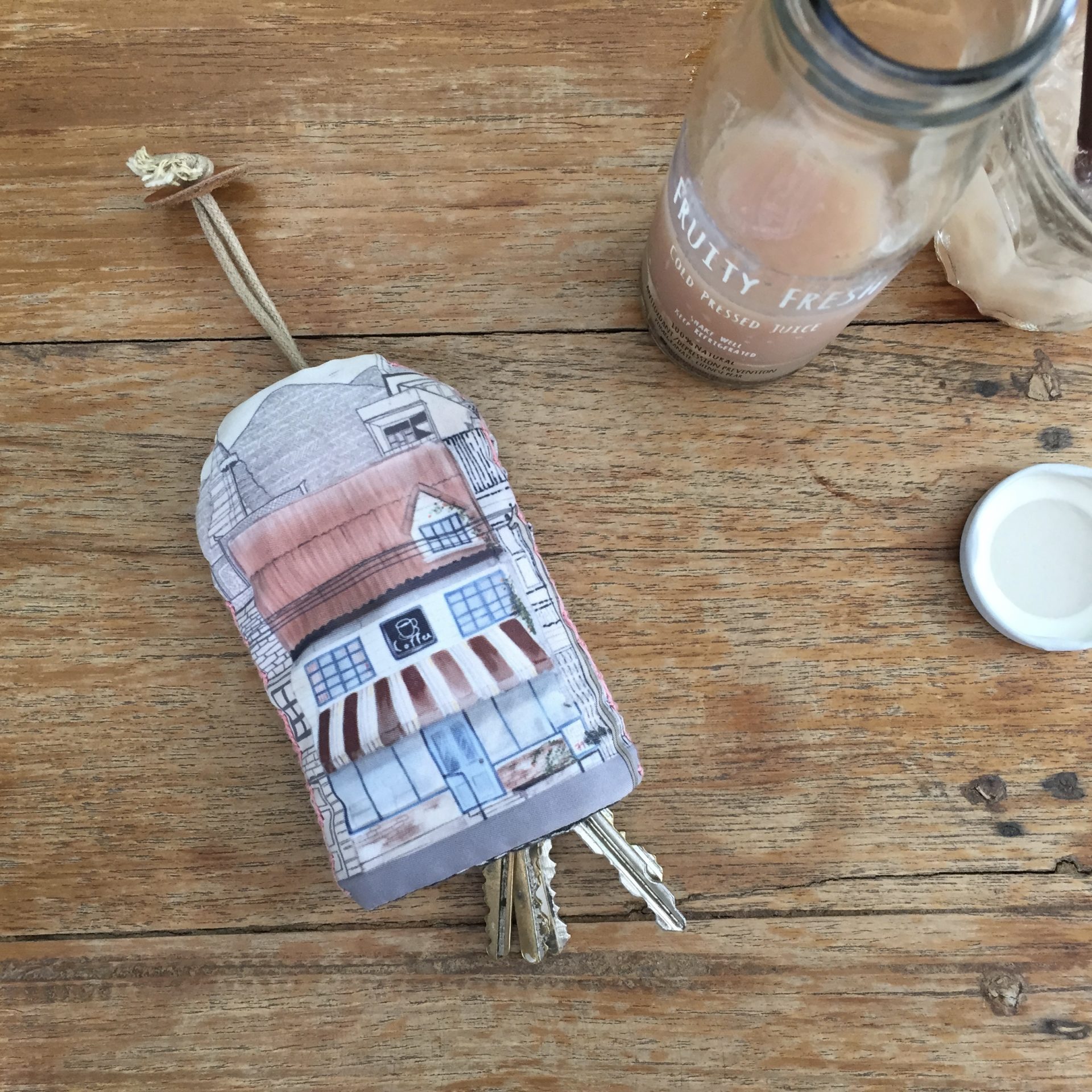 ที่เก็บกุญแจ รูปทรงบ้าน ใช้สำหรับเก็บ และแยกพวงกุญแจแต่ละประเภท ผลิตจากวัสดุผ้าโพลีเอสเตอร์พิมพ์ลาย บุฟองน้ำเนื้อหนา เพื่อป้องกันการเสียดสีของลูกกุญแจ กับของอื่น เมื่อต้องเก็บรวมภายในกระเป๋า