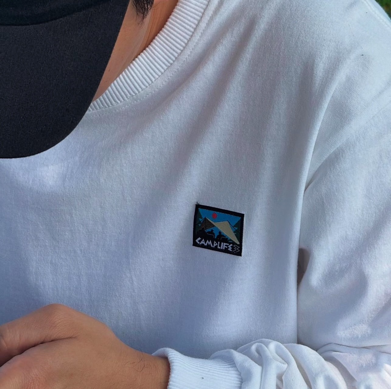 The front has a woven camplife3 logo. The back has a logo printed on the fabric. Comfortable to the touch. The fabric is made from thick C16 cotton, not too soft. The collar and sleeve cuffs are made from thick ribbed fabric.